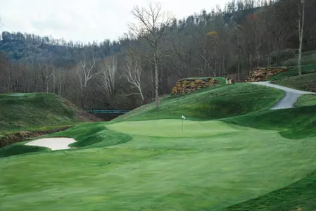 Spread out over 250 acres amidst the Appalachian Mountains, the fairways bob and weave through wildly rugged terrain and Dye’s graceful earth sculptures.